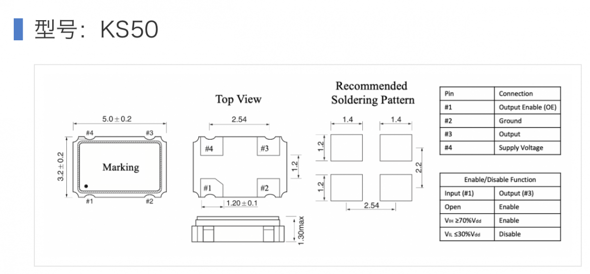 四腳有源晶振: 外殼左下角常有一個(gè)點(diǎn)(?)表示1 腳。此類產(chǎn)品有方向性必須按腳位定義焊接。例如KS50(5.0×3.2mm 4-pad),1為三態(tài)/使能(OE/EN),2為接地,3為輸出,4為Vcc(不同型號(hào)請(qǐng)參照 datasheet)。