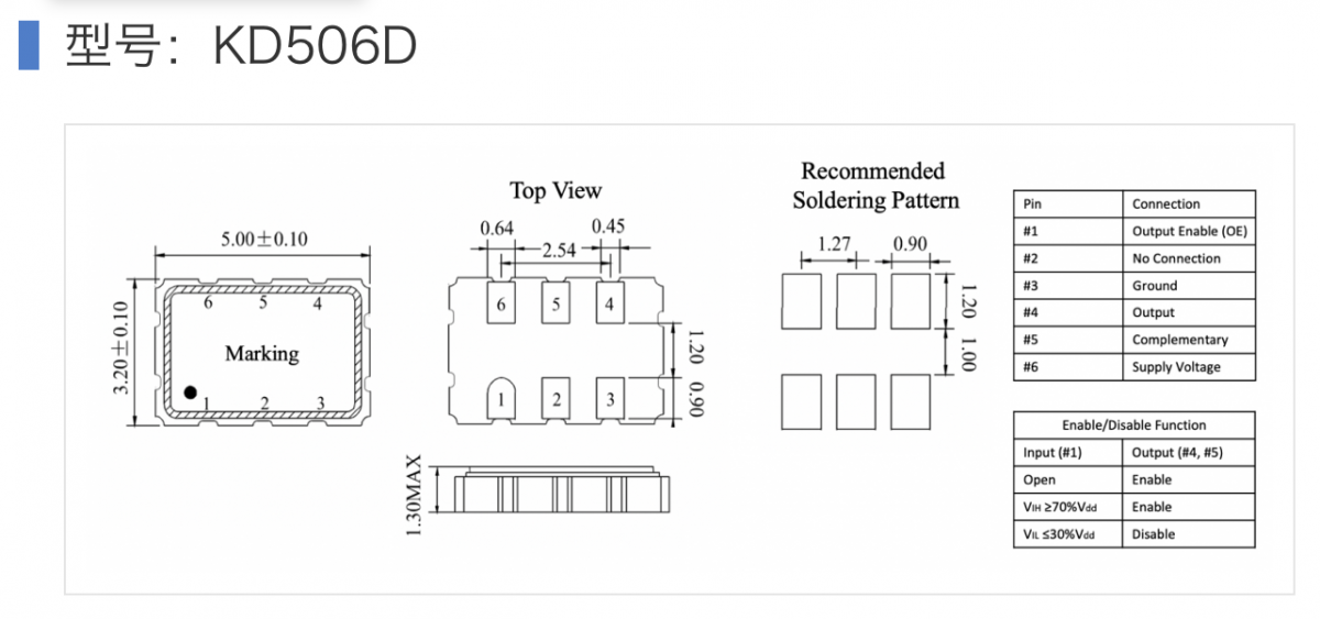≥六腳:六腳及以上的晶振一定是有源晶振 ,一定有方向性。例如:KS506D(5.0×3.2mm 6pad LVDS):1為三態(tài)端,2為懸空,3為接地,4為正向輸出,5為反向輸出,6為電源。