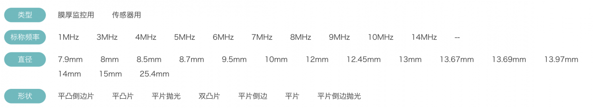 KOAN現(xiàn)有以下系列QCM晶體提供,根據(jù)應(yīng)用不同大致分為膜厚監(jiān)測用和傳感器用兩大類。標(biāo)稱頻率從1MHz~14MHz;晶片直徑7.9mm~25.4mm。