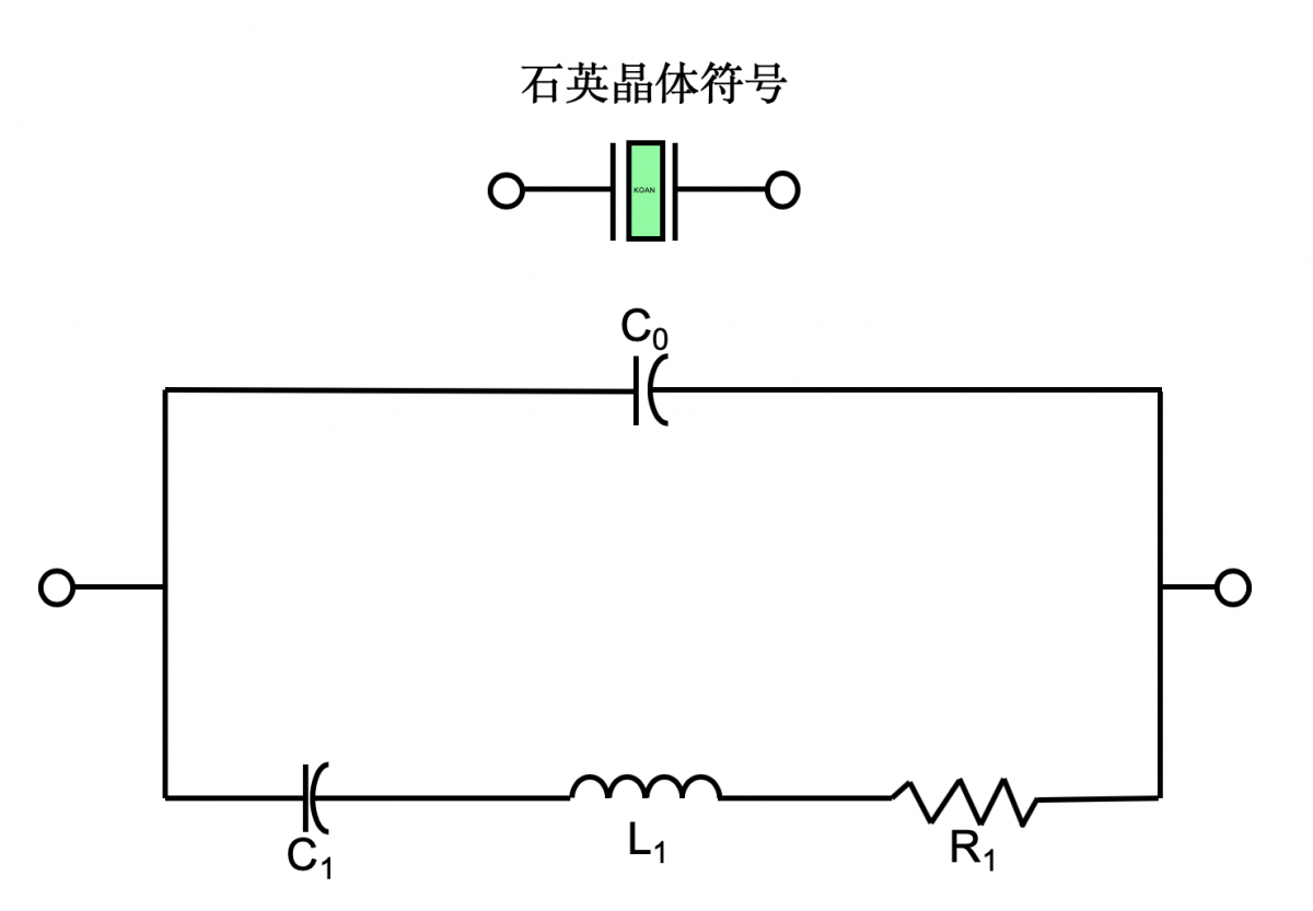 石英晶體的壓電諧振現(xiàn)象可以用等效電路來模擬。等效電路包括靜態(tài)電容C0,動態(tài)電容C1,諧振電阻R1,以及動態(tài)電感L1。等效電路圖如圖: