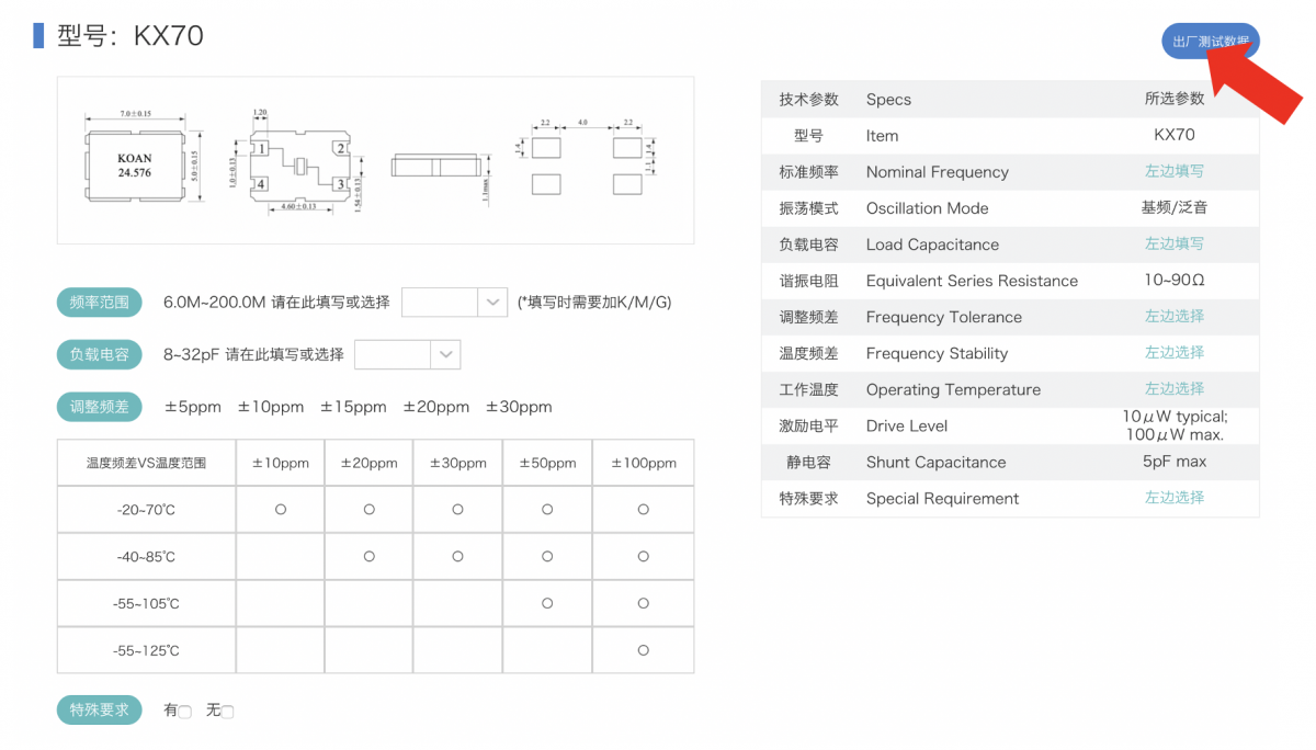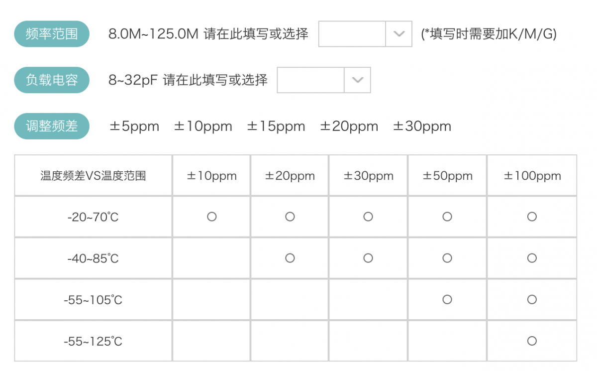 采購晶體時必選的參數(shù)以KX32為例,除了‘頻率范圍’ ‘負載電容’,‘調整頻差’和‘溫度頻差’是必須選擇的參數(shù):