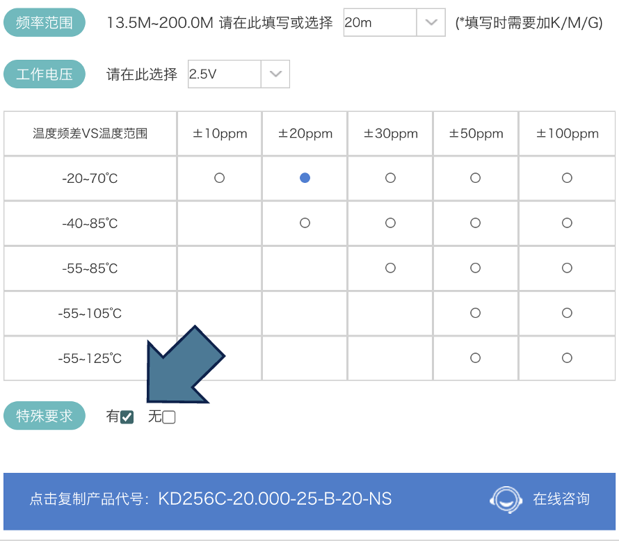 如果您對晶振參數(shù)有特殊的需求,可以在官網(wǎng)參數(shù)選擇頁面,”特殊要求"欄目中選中“有”并復(fù)制產(chǎn)品代號,點擊在線咨詢。