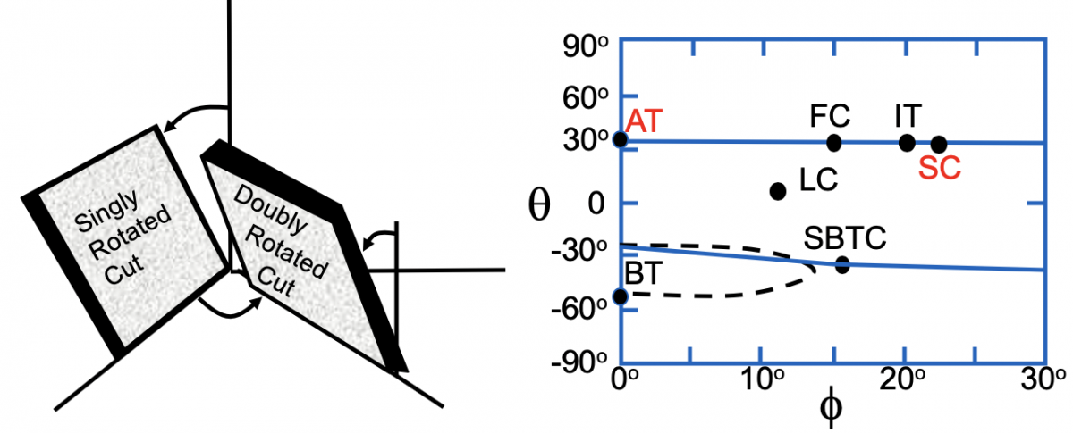 在高精度石英晶體振蕩器系列如OCXO恒溫晶振, 通常會(huì)使用到SC切割(也叫應(yīng)力補(bǔ)償切割) 的石英晶片。SC切切割角度是基于x,y,z基礎(chǔ)坐標(biāo)的雙旋轉(zhuǎn)如左圖所示。雙旋轉(zhuǎn)的切角分別為21.93°(橫坐標(biāo)) 和 34.11°(縱坐標(biāo))如右圖所示。SC切晶振的頻率范圍一般是0.5~200 MHz。
