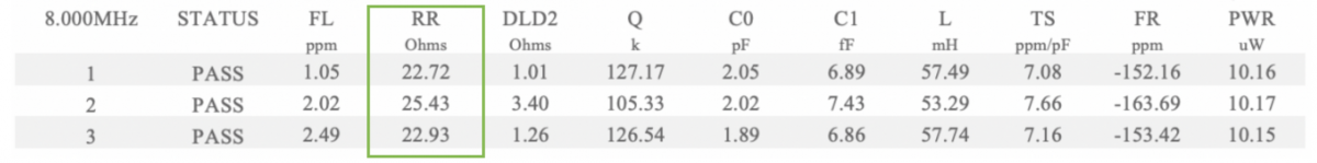 RR越小,晶體的品質(zhì)因數(shù)Q越高。晶體的能量損耗越小,振蕩性能越好。 RR可以通過(guò)S&A250B網(wǎng)絡(luò)分析儀可以測(cè)量。以下是我們實(shí)際的測(cè)量數(shù)據(jù).前往《晶體諧振器電性能參數(shù)介紹》可了解無(wú)源晶振測(cè)試報(bào)告中參數(shù)的含義。