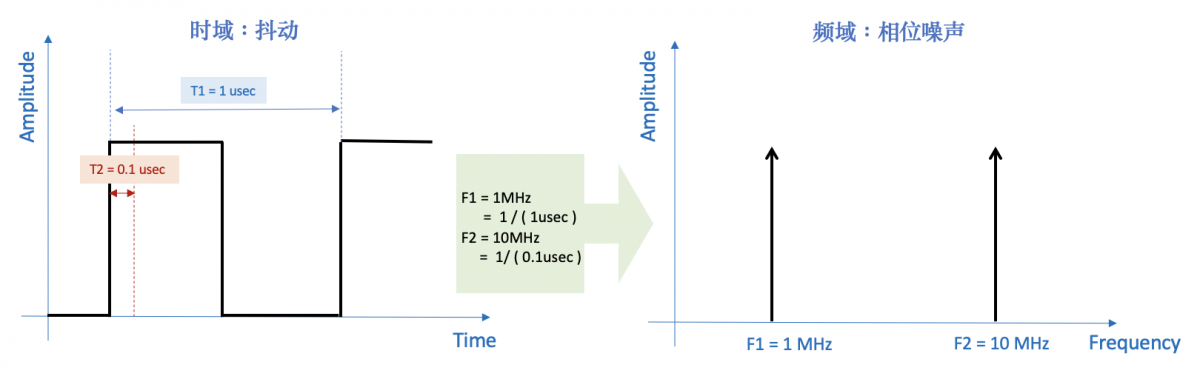晶振的短期頻率穩(wěn)定度由噪聲引起導(dǎo)致的頻率不穩(wěn)定。其中,電噪聲是根本原因。電噪聲包括熱噪聲,散彈噪聲,以及閃變噪聲。導(dǎo)體的無規(guī)律熱運動帶來熱噪聲。從頻域來看,對應(yīng)的參數(shù)是相位噪聲(Phase Noise);從時域來看,對應(yīng)的參數(shù)是抖動(Jitter)。時間和頻域之間的關(guān)系互為倒數(shù)Time=1/Frequency。