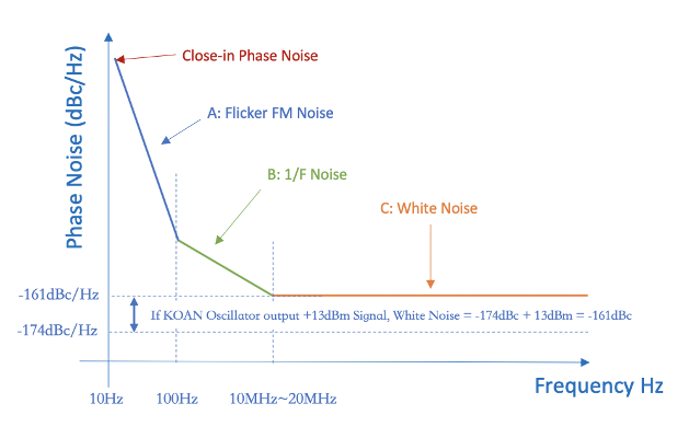 若沒有相位噪聲,振蕩器的整個功率都集中在f0(10MHz為例),功率頻譜就是一條以f0為中心的直線,且信號為純正的正弦波。但是任何信號都有不穩(wěn)定性,從而產(chǎn)生了邊帶sideband。相位噪聲通常定義為一個振蕩器在某一偏移頻率fm處1Hz寬帶內(nèi)的單邊信號功率和信號的總功率比值,單位是dBc/Hz.通常表示為dBc/Hz@fm。