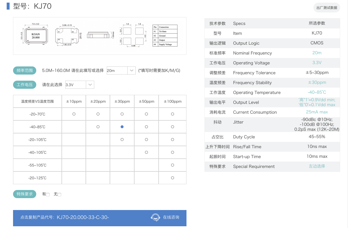 第三步: 進(jìn)入?yún)?shù)選擇,您可以勾選參數(shù),右側(cè)的規(guī)格書以便為您提供參考。復(fù)制生成的產(chǎn)品代號后,您可以和KOAN客服在線溝通。