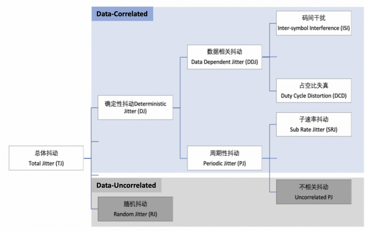 抖動是信號偏離理想位置的程度,表示的是時域特征。單位一般用pS,fS表示。抖動分為確定性和隨機(jī)性抖動。確定性抖動是可識別的干擾信號造成的,這種抖動的幅度有限??偠秳拥臉?gòu)成如下: