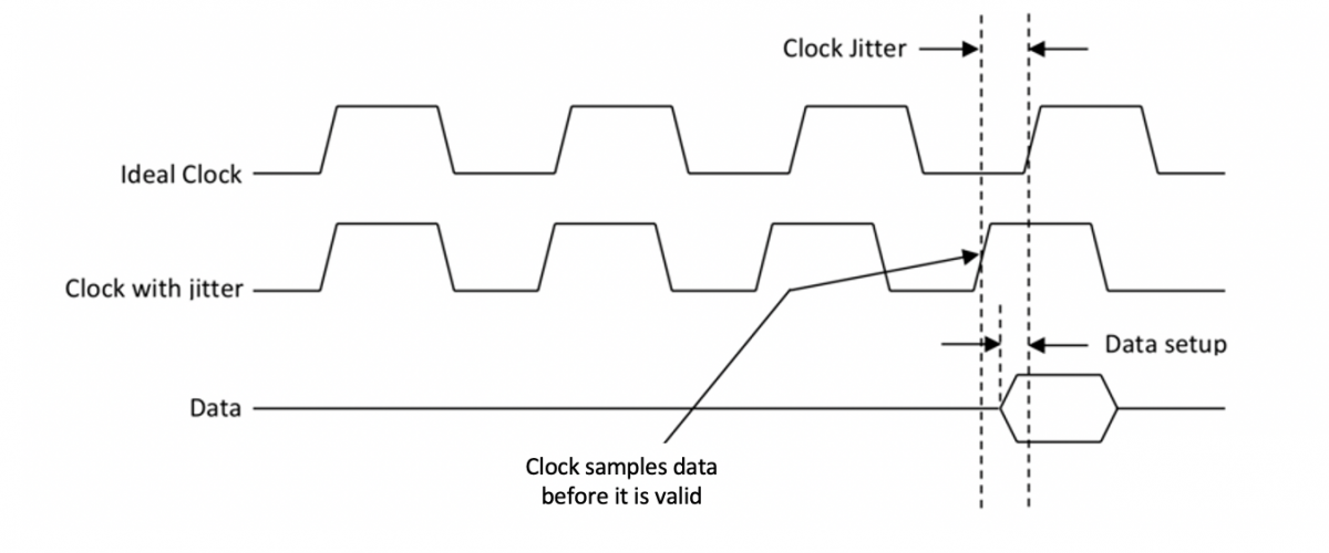 假設(shè)有一個微處理器系統(tǒng),其中處理器的時鐘上升前需要1ns的數(shù)據(jù)設(shè)置。如果時鐘的周期抖動為-1.5ns,那么時鐘的上升沿可能發(fā)生在有效期之前。因此微處理器將顯示不正確的數(shù)據(jù):