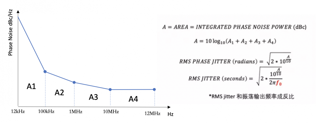 RMS Jitter是對相位噪聲圖的弧面的面積做積分的計算。計算公式如下。最后的RMS Jitter值與振蕩輸出頻率成反比。
