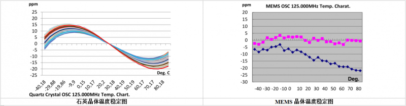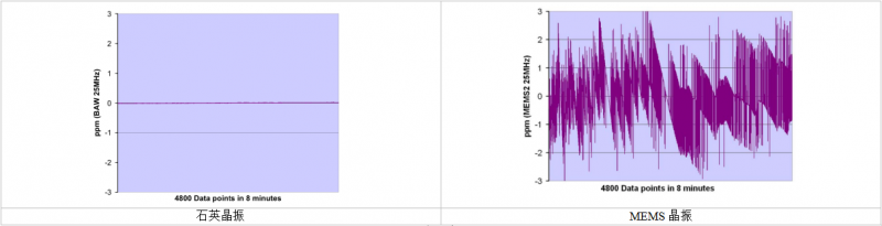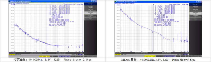 我們選取了同樣頻率的石英振蕩器和MEMS振蕩器進(jìn)行對(duì)比。