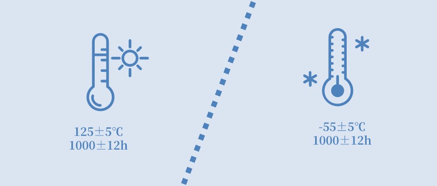 溫度循環(huán):低溫-40±5℃,高溫125±5℃,循環(huán)1000次,高低溫度保持最長時間30分鐘,高低溫切換時間最大1分鐘,實驗結(jié)束后24±2小時進(jìn)行電性能測試.